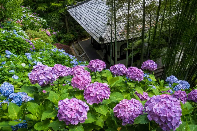 特に梅雨の時期のアジサイは有名で、境内山腹に整備された眺望散策路(通称「あじさい路」)には約40種類2,500株もの色とりどりのアジサイが咲き誇り、毎年多くの人で賑わいます。