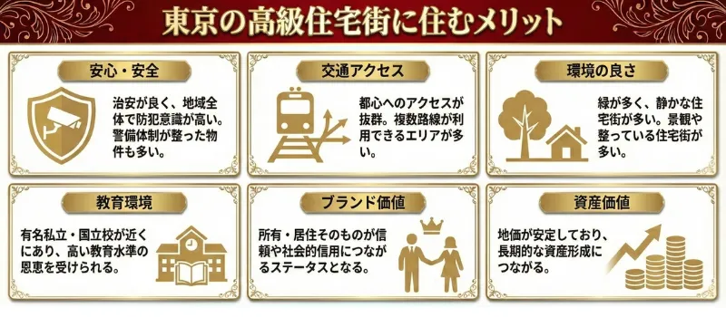 では、高級住宅街に住むことで、実際にどんな恩恵が得られるのでしょうか。以下にメリットをまとめました。