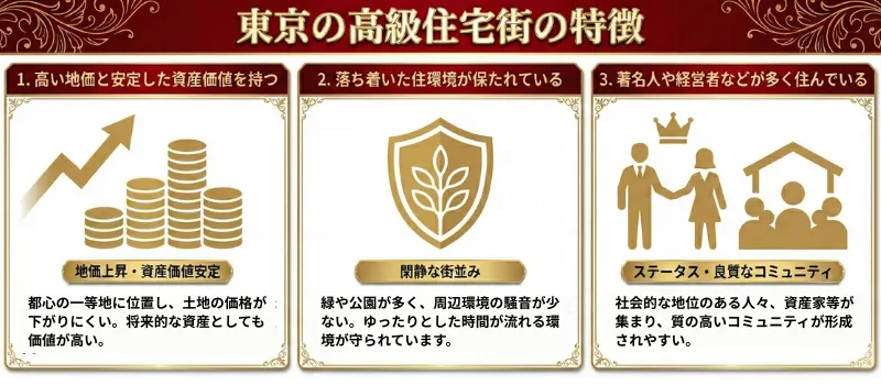 東京の高級住宅街は、「お金持ちの街」という側面だけではなく、暮らしの満足度が高い街です。地価や家賃の高さには、日常の安心・利便性・環境の良さといった価値が反映されています。