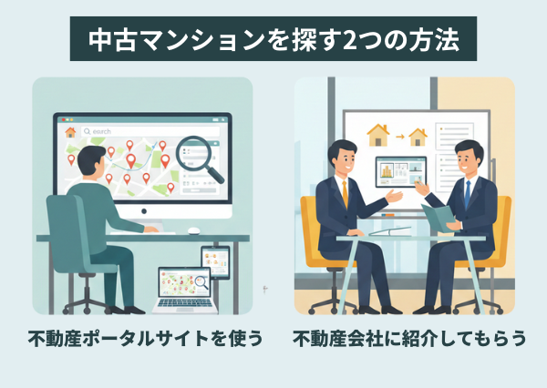 中古マンションの探し方は、大きく分けると、自分で不動産のポータルサイトを使って探すか、不動産会社に紹介してもらうかの2つです。